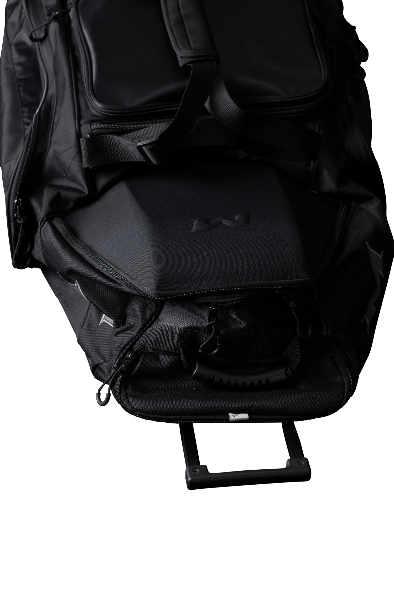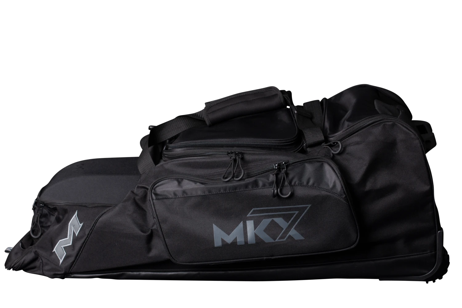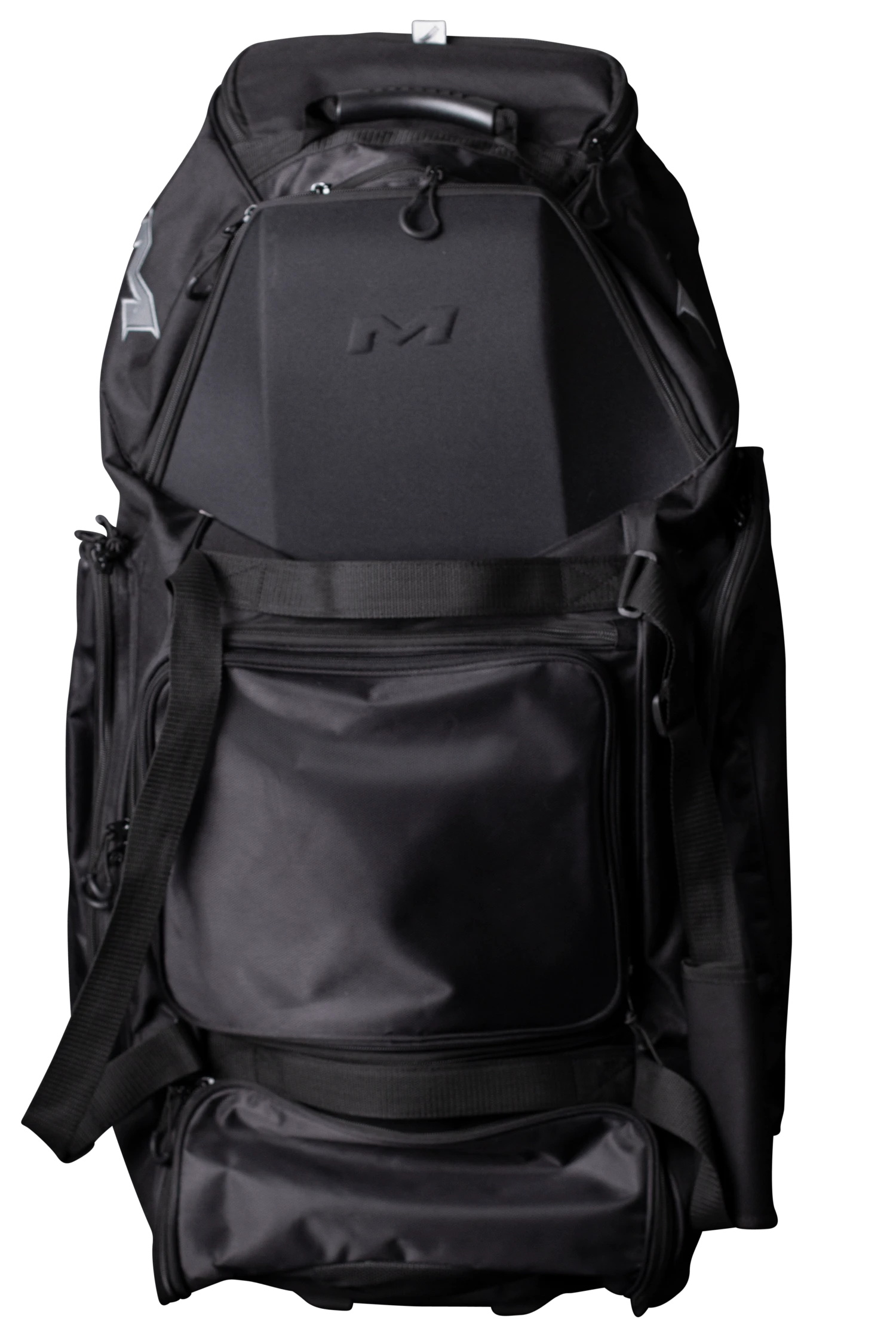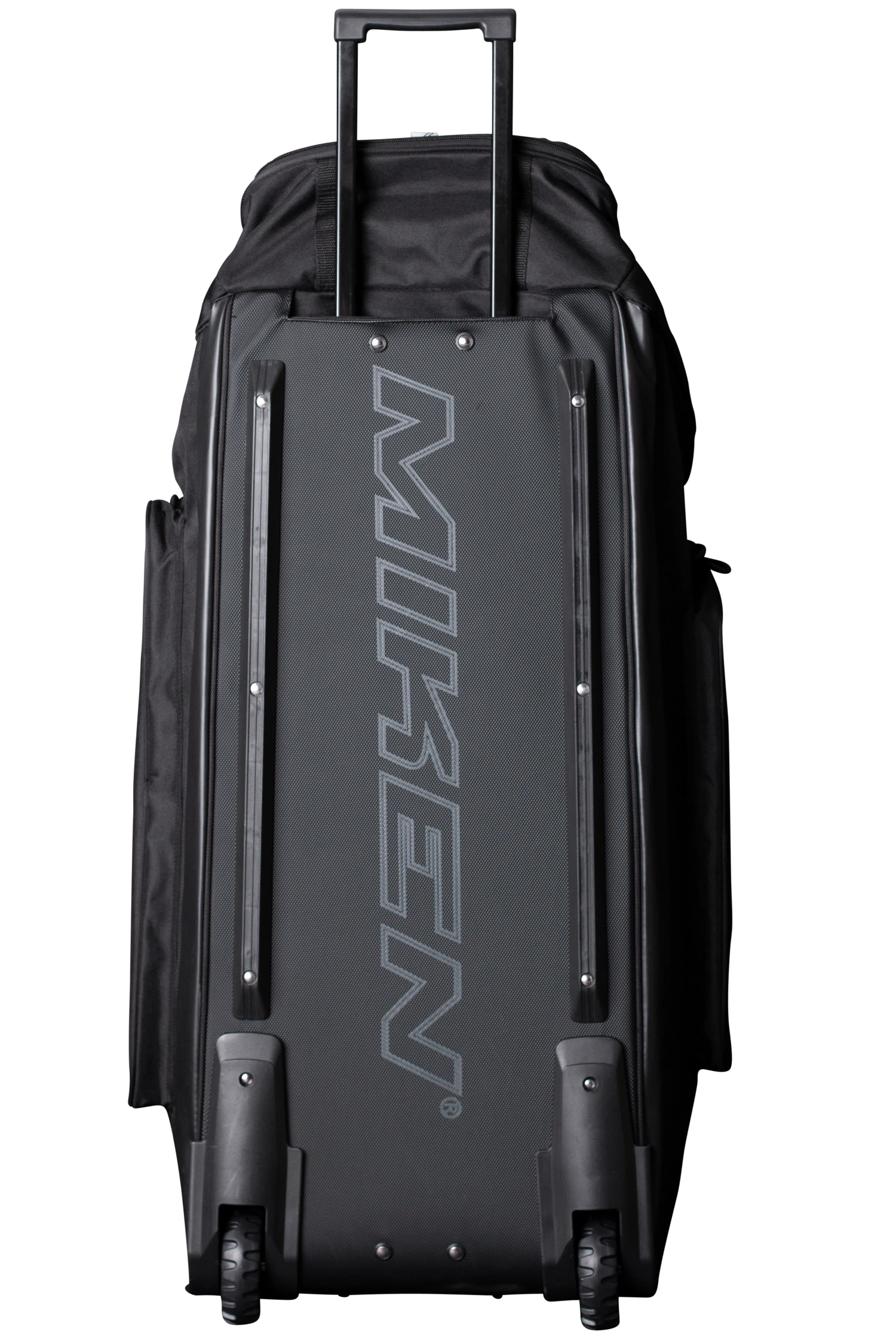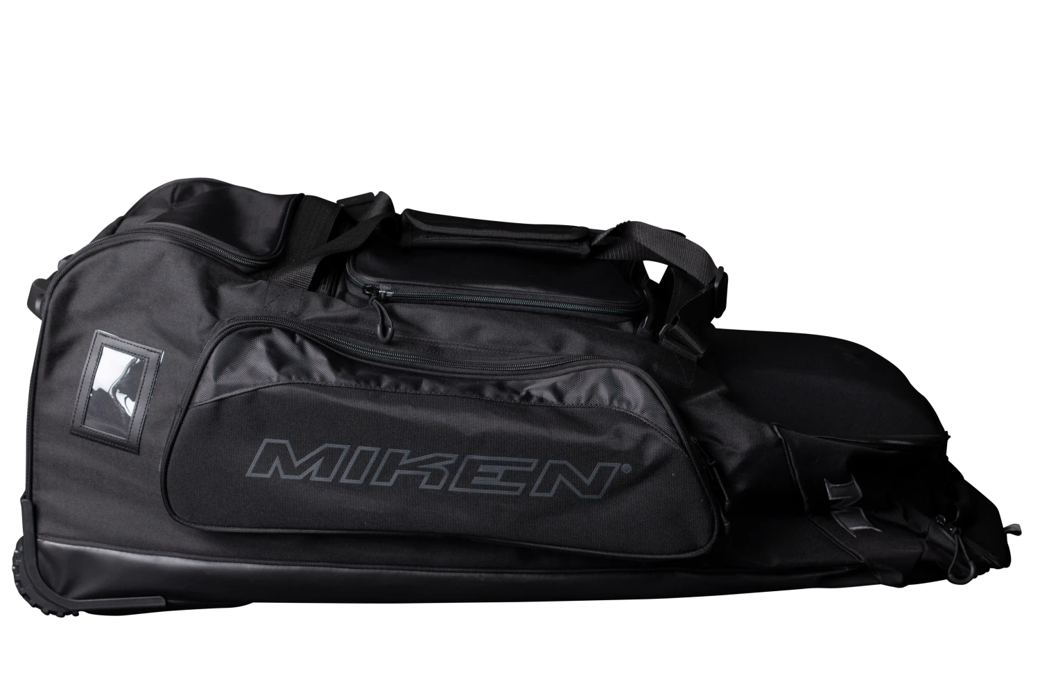 The all new Miken Championship Bag features a padded 4 individual bat compartment, a telescoping handle, Wide set tank wheels with full bottom rails and extra base support for strength, balance, and durability, a vented shoe compartment, extra large main compartment and 2 smaller compartments, molded top converts to a shelf, removable decoration panel for customization, easy grip handles, clear ID window and durable “J” style hook.