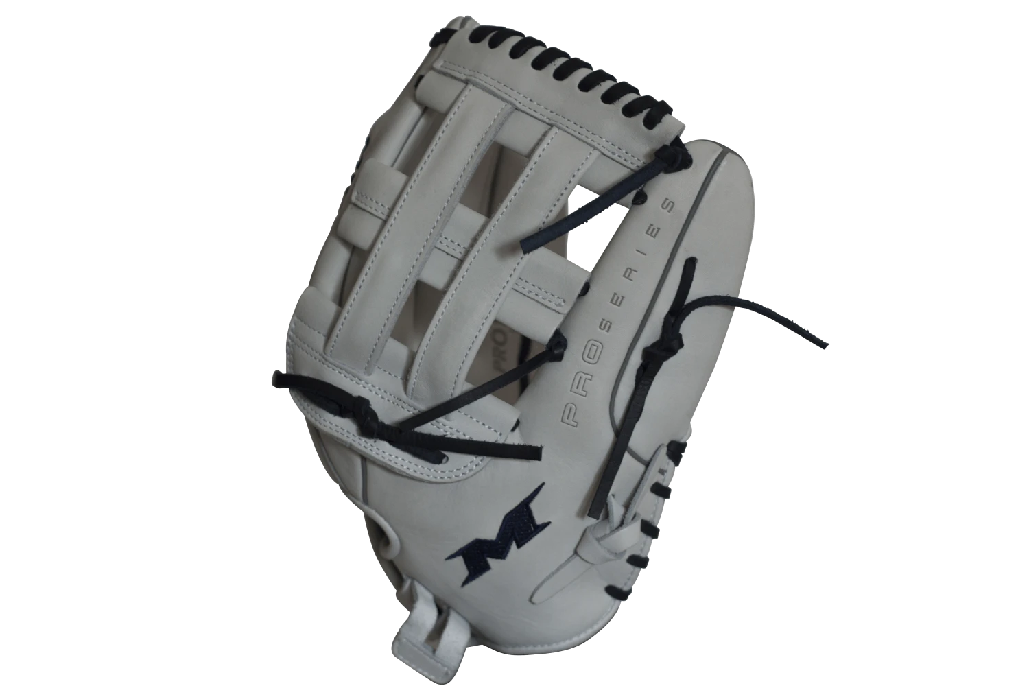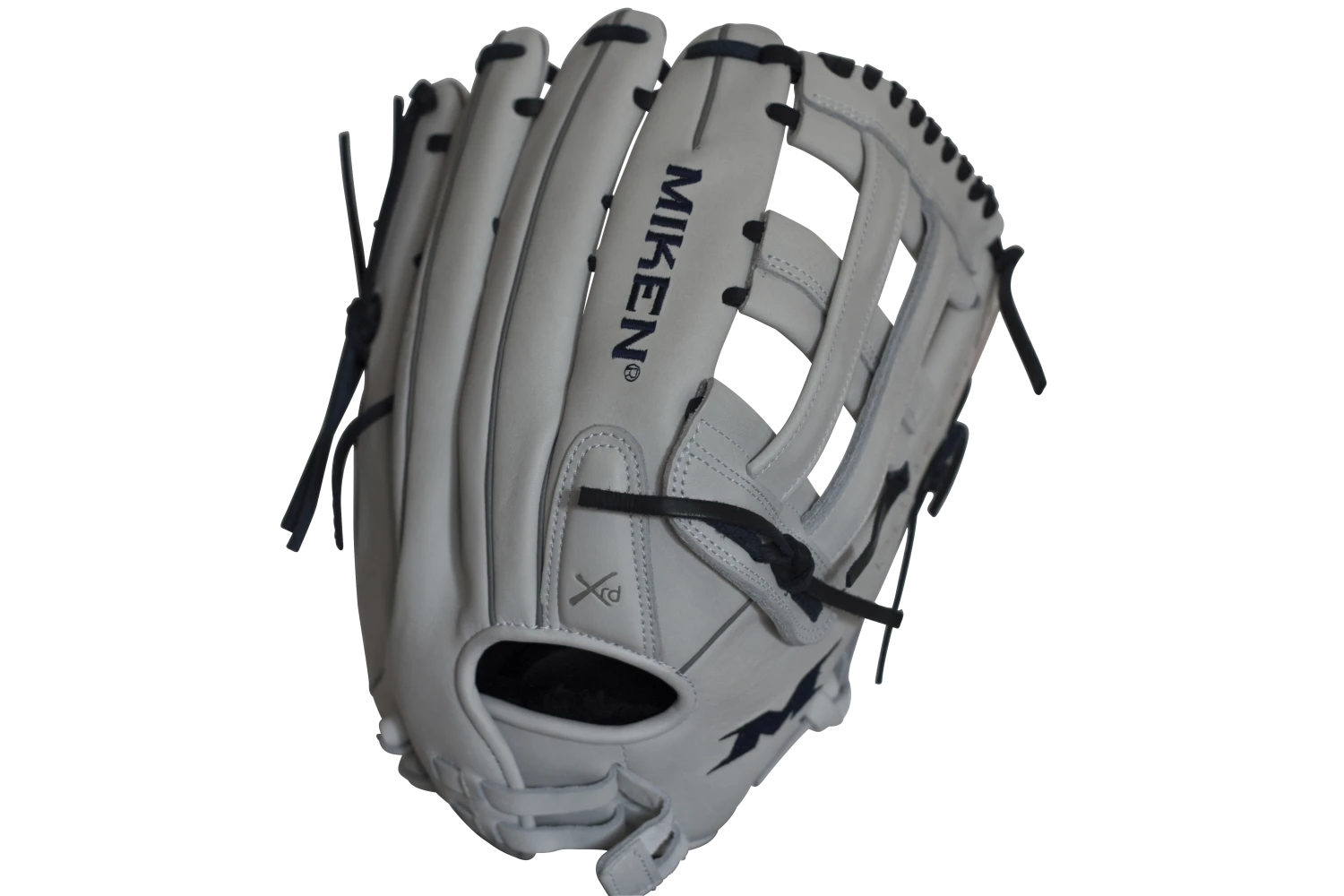 Let us help you gear up for the 2019 year with this 14″ White and Navy Slowpitch Softball Fielding Glove, featuring Mikens Pro H-Web Pattern designed for adult softball. Order today with our fast free shipping here at headbangersports.com!Â